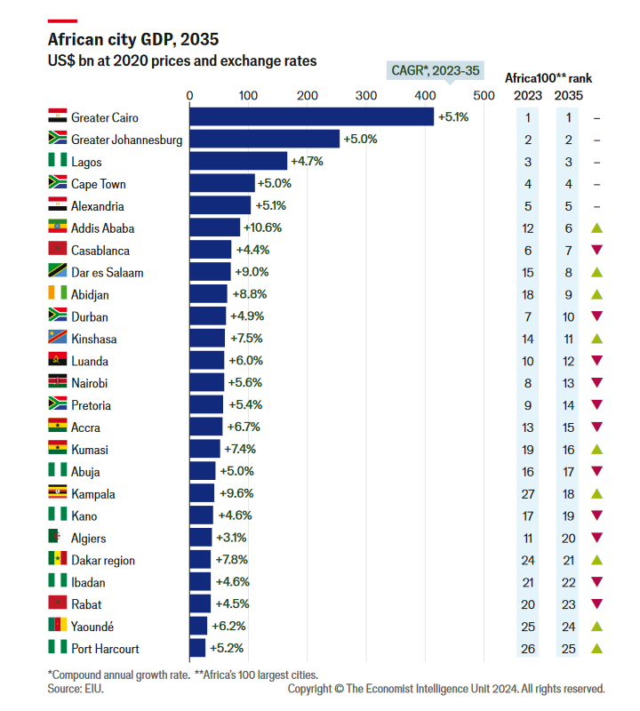 “The largest of the Africa100 city economies—namely Cairo, Johannesburg, Lagos, Cape Town and Alexandria—will grow at a reasonable pace (CAGRs of real GDP measured in 2020 prices and exchange rates of 4-5 per cent in 2023-35) and will retain their position at the top of the city economy rankings in 2035.” EIU report read.
