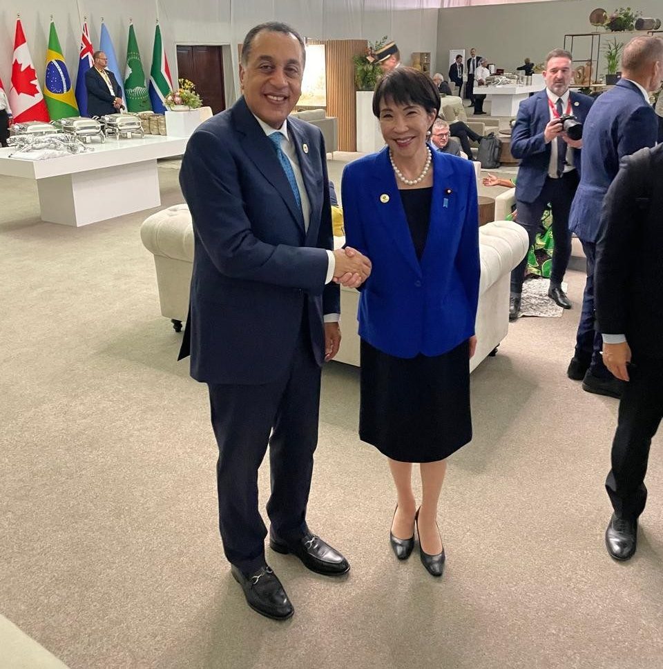 Egyptian Prime Minister Moustafa Madbouly met Japan’s Prime Minister Sanae Takaichi on Sunday on the sidelines of the 2025 G20 Summit in Johannesburg, with both leaders highlighting efforts to expand bilateral cooperation across technology, education, and economic sectors.