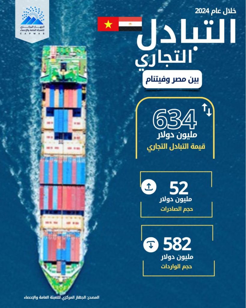 Trade between Egypt and Vietnam rose to $634 million in 2024 from $606 million a year earlier, Egypt’s statistics agency CAPMAS said on Tuesday, ahead of talks in Cairo between President Abdel Fattah al-Sisi and his Vietnamese counterpart Luong Cuon on boosting ties.