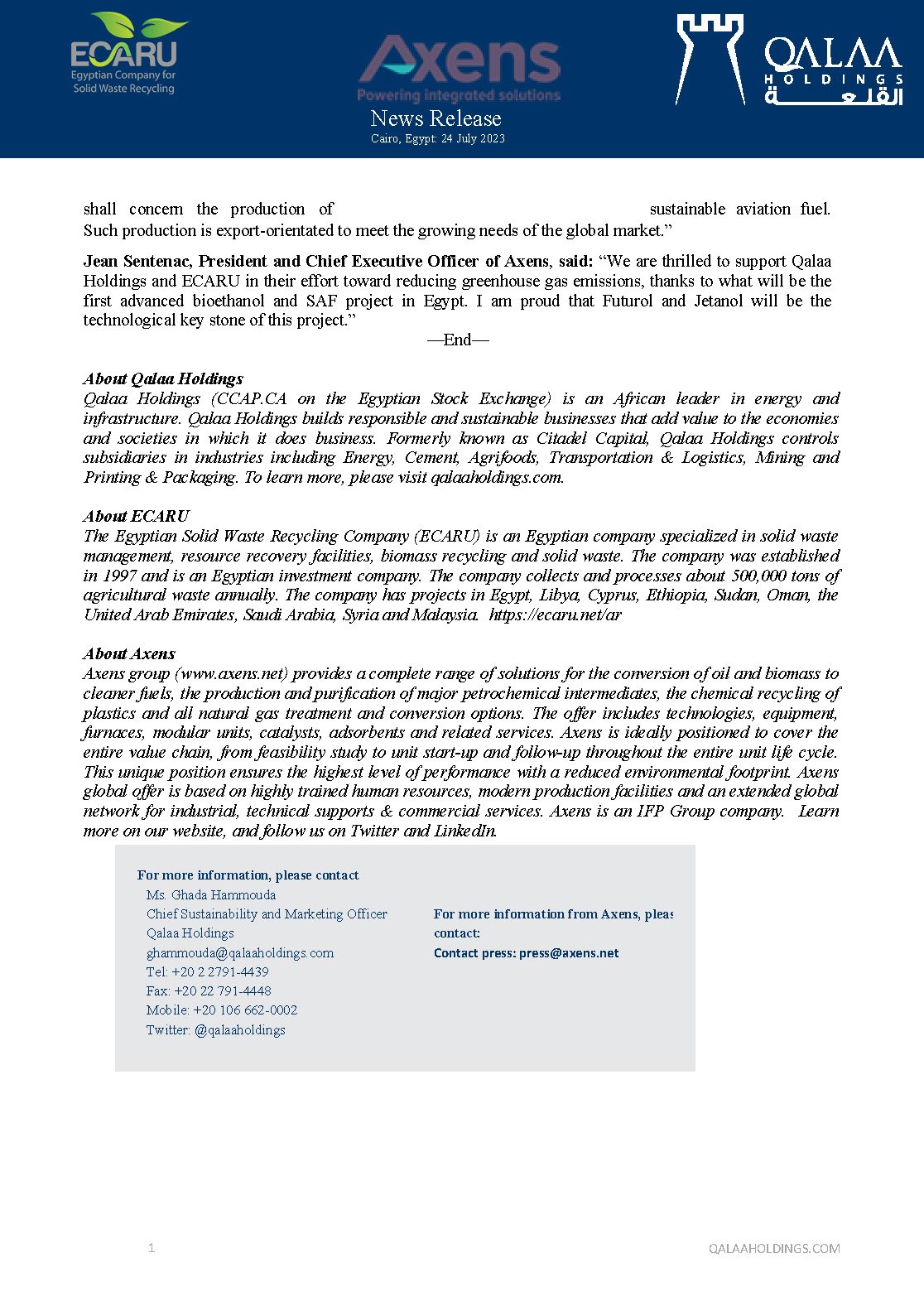 Jean Sentenac, president and CEO of Axens, said: “We are thrilled to support Qalaa Holdings and ECARU in their effort toward reducing greenhouse gas emissions, thanks to what will be the first advanced bioethanol and SAF project in Egypt. I am proud that Futurol anti Jetanol will be the technological key stone of this project.”