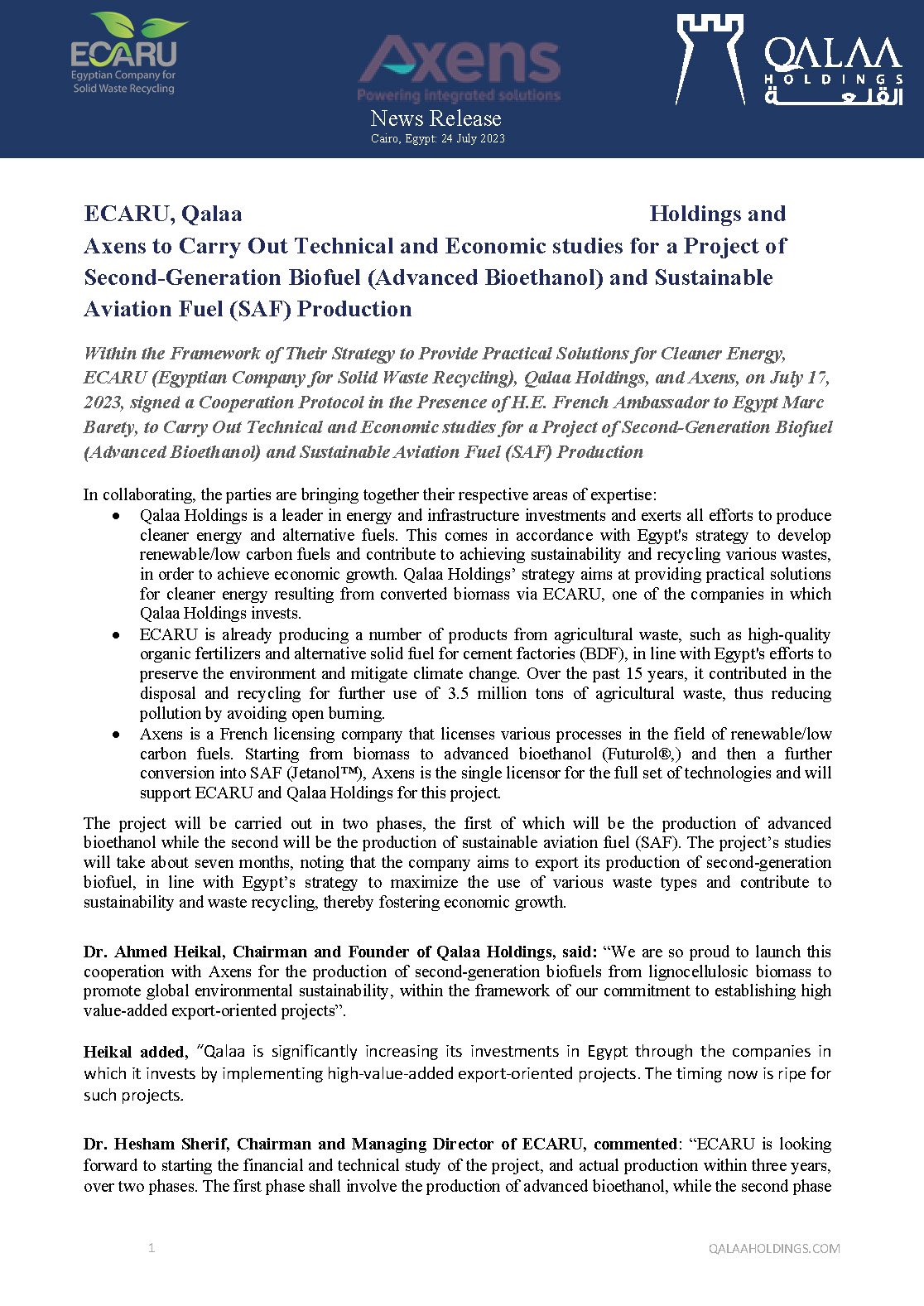 “We are so proud to launch this cooperation with Axens for the production of second-generation biofuels from lignocellulosic biomass to promote global environmental sustainability, within the framework of our commitment to establishing high value-added export-oriented projects.” Ahmed Heikal, chairman and founder or Qalaa, said.