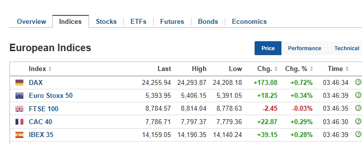 The pan-European STOXX 600 was up 0.36 per cent by 7:46 GMT. Germany’s DAX led major indexes with a 0.72 per cent gain, followed by France’s CAC 40, which rose 0.29 per cent.
