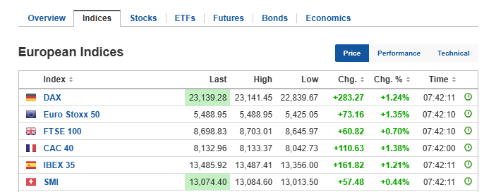 The pan-European STOXX 600 index rose 1.35 per cent as of 7:42 AM ET (11:42 AM GMT). Germany’s DAX gained 1.24 per cent, while France’s CAC 40 advanced 1.38 per cent. Spain’s IBEX 35 climbed 1.21 per cent, and the UK’s FTSE 100 added 0.70 per cent.