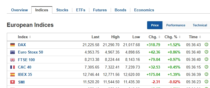 The pan-European STOXX 600 rose 0.86 per cent by 9:36 AM GMT, led by Germany’s DAX, which gained 1.52 per cent. Spain’s IBEX 35 added 1.39 per cent, the UK’s FTSE 100 climbed 0.97 per cent, and France’s CAC 40 edged up 0.45 per cent.