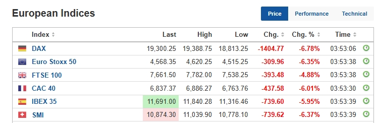 The pan-European STOXX 600 index dropped 6.35 per cent by mid-morning, with Germany’s DAX falling 6.78 per cent, France’s CAC 40 down 6.01 per cent, Spain’s IBEX 35 slipping 5.95 per cent, and the UK’s FTSE 100 shedding 4.88 per cent.