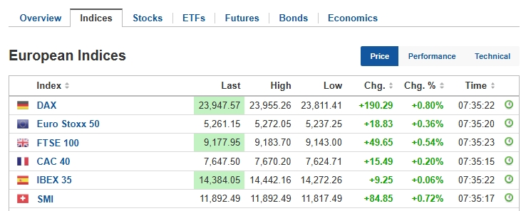 The pan-European STOXX 600 index was up 0.36 per cent by 11:35 a.m. GMT. Germany’s DAX led the gains with a 0.80 per cent rise, followed by the UK’s FTSE 100, which advanced 0.54 per cent. France’s CAC 40 added 0.20 per cent, while Spain’s IBEX 35 inched up 0.06 per cent.