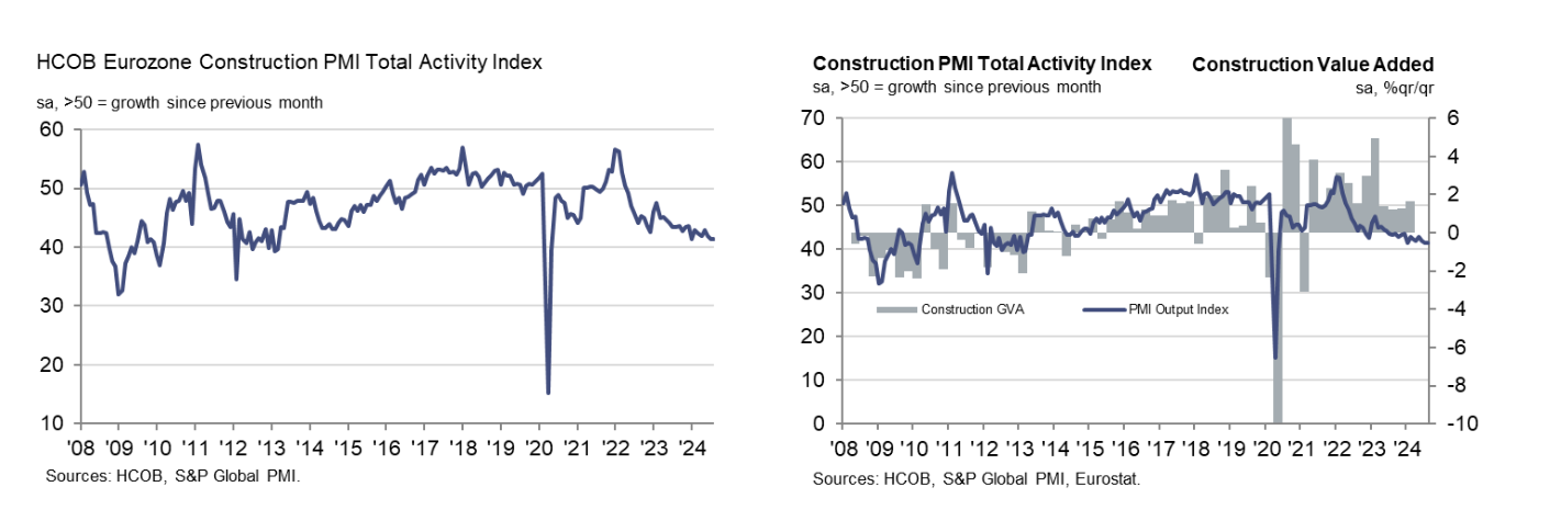 New orders fell for the twenty-ninth consecutive month, contributing to reduced construction activity across Germany, France, and Italy.