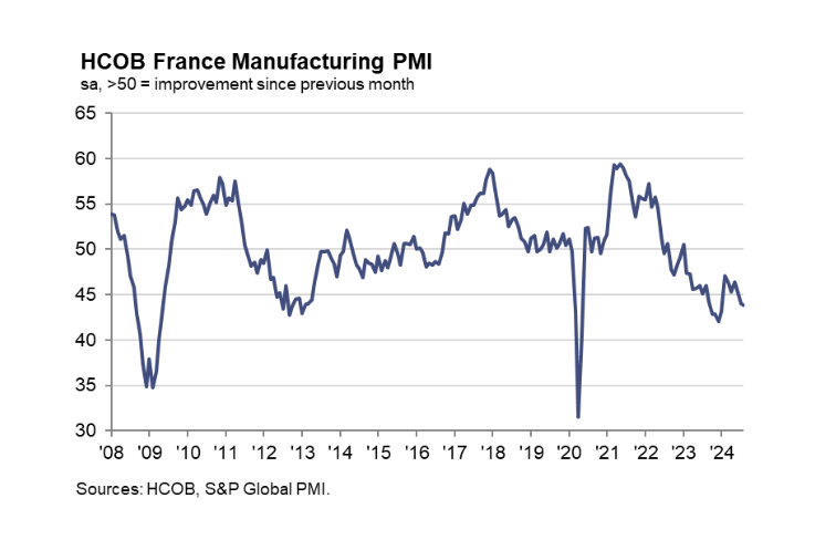 France’s manufacturing sector faced a significant downturn in August, according to the latest HCOB PMI data released on Monday. The manufacturing PMI fell to 43.9 from 44.0 in July, marking the sharpest deterioration in factory conditions in seven months.