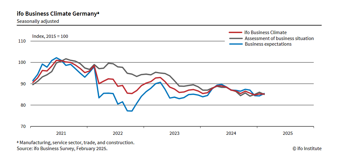 German business morale remained subdued in February as the ifo Business Climate Index held steady at 85.2, highlighting persistent skepticism among companies.While current business conditions worsened slightly, expectations showed some improvement, signaling cautious optimism.