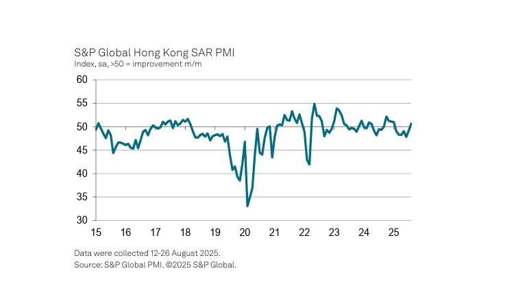 Hong Kong’s private sector returned to growth in August, with the headline seasonally adjusted S&P Global Hong Kong SAR Purchasing Managers’ Index (PMI) rising to 50.7 from 49.2 in July, marking its highest reading since early 2025.