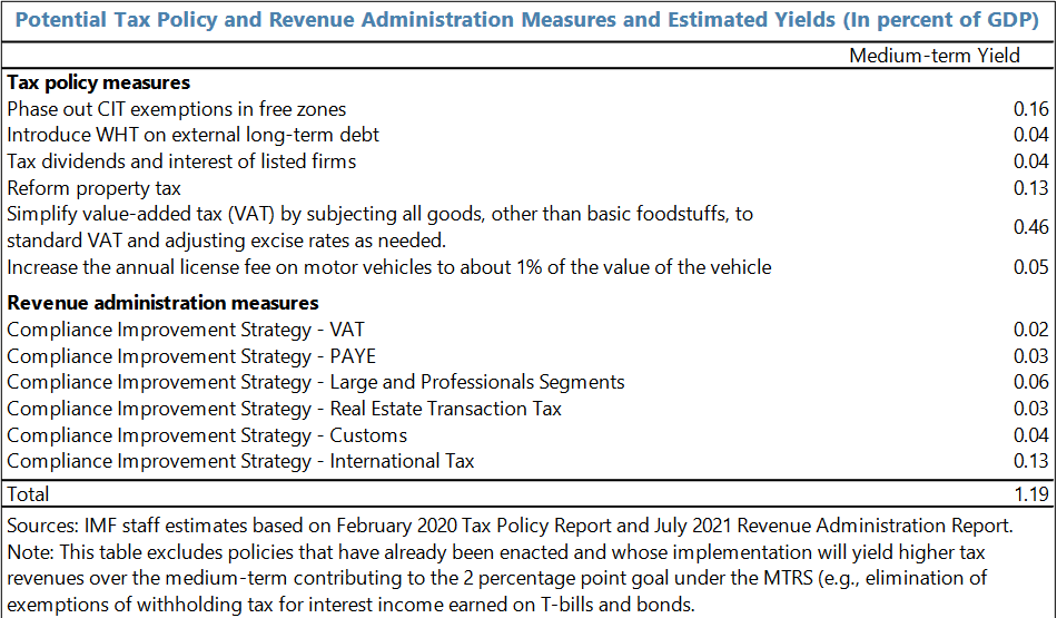 “Domestic revenue mobilisation will support debt reduction and create fiscal space for priority areas. Tax policy and revenue administration measures based on the approved Medium-Term Revenue Strategy will aim to increase tax-to-GDP ratio by around 2 percentage points over the medium term.”