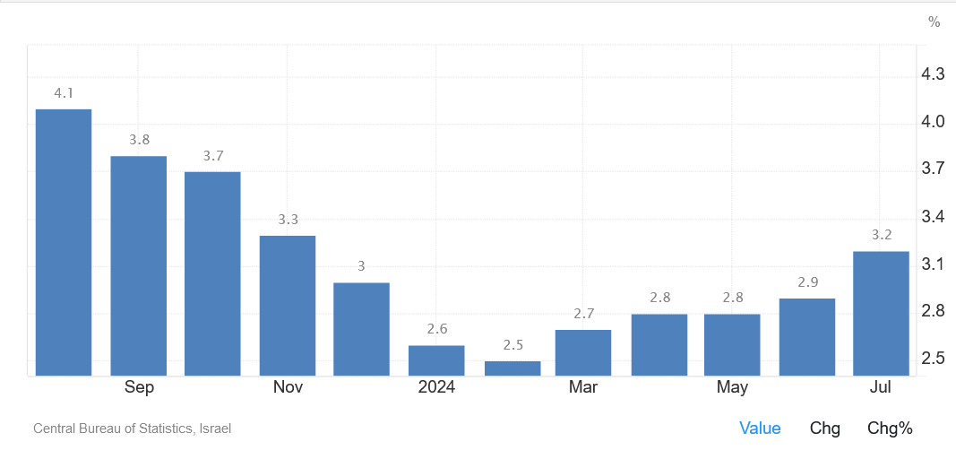 Israel’s annual inflation rate surged to 3.2 per cent in July, data from the Central Bureau of Statistics showed on Thursday, marking the highest level since November 2023. The figure surpasses both the central bank and government’s target range and market expectations.