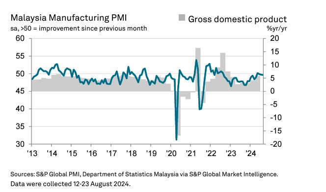 Malaysian manufacturing sector experienced a slight decline in August 2024, as per the S&P Global Malaysia Manufacturing Purchasing Managers’ Index (PMI) which stayed at 49.7, signalling a small decrease in operating conditions.