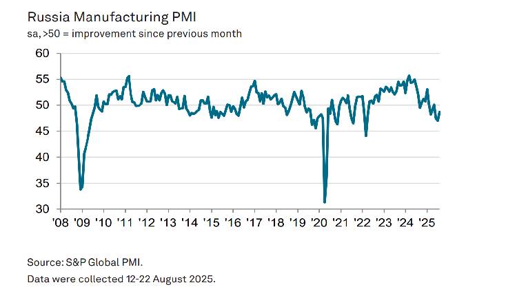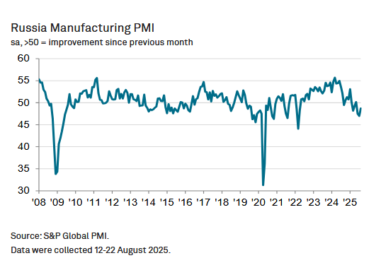 Russia’s manufacturing sector contracted for a third straight month in August, though at a softer pace, as weak demand continued to weigh on output and new orders, S&P Global said on Monday.