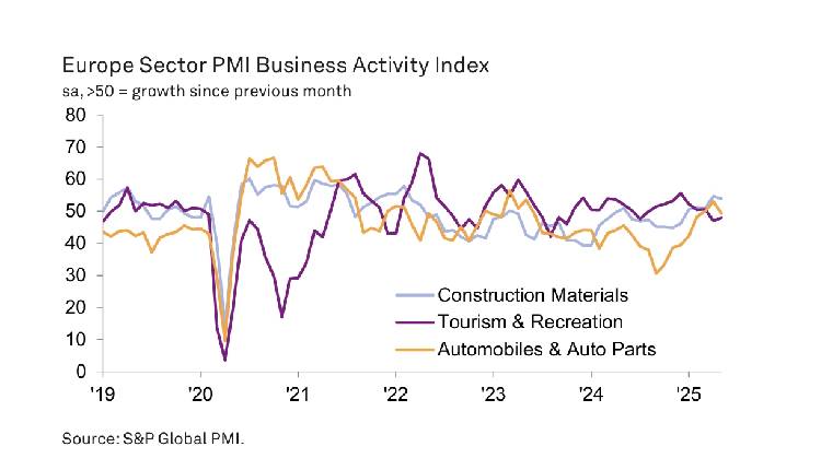 European sectors showed weak performance in May, with only seven of 19 monitored industries recording business growth—the lowest since July 2024, according to the latest S&P Global Europe Sector PMI. Manufacturing segments faced renewed contractions, dragging down overall results amid soft demand.