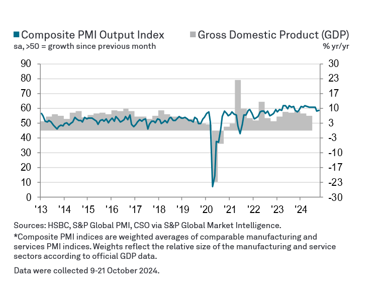 This figure remained firmly in growth territory (above 50.0) for the thirty-ninth consecutive month. Moreover, it rose from a final reading of 58.3 in September and surpassed its long-run average of 54.7. The acceleration in growth was supported by quicker increases in both factory production and services activity.