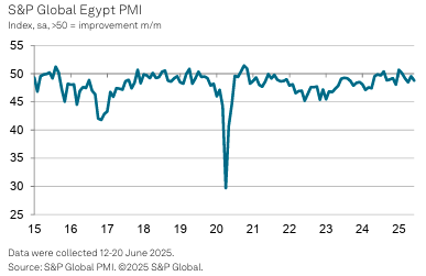 Egypt’s non-oil private sector continued to shrink in June 2025, with the S&P Global Purchasing Managers’ Index (PMI) declining to 48.8 from 49.5 in May, remaining below the 50.0 threshold for the fourth consecutive month and signalling a modest deterioration in business conditions.