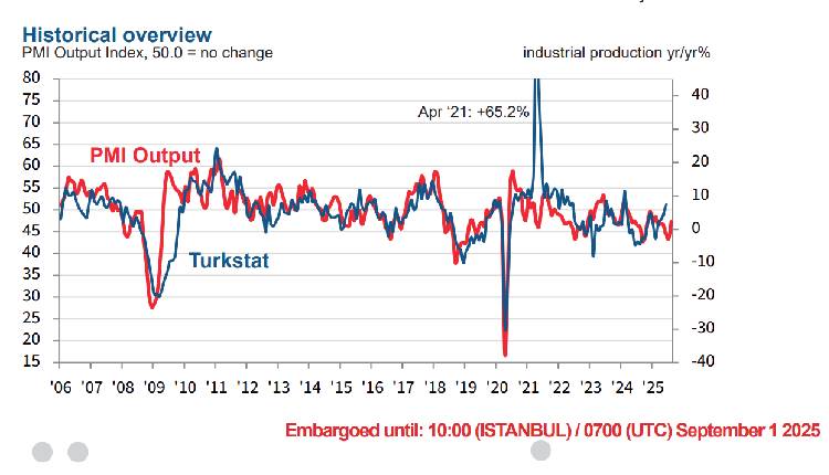The Istanbul Chamber of Industry’s Türkiye Manufacturing Purchasing Managers’ Index (PMI), compiled by S&P Global, rose to 47.3 in August from 45.9 in July, staying below the 50.0 threshold that separates growth from contraction. The latest reading marked the mildest downturn since April.