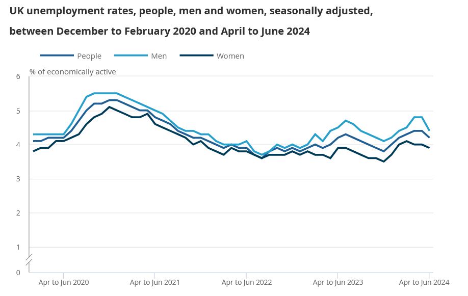 The UK unemployment rate for April to June 2024 dropped to 4.2 per cent, improving from the previous year and declining in the latest quarter, a labour force survey by Office for National Statistics (ONS) showed on Tuesday.