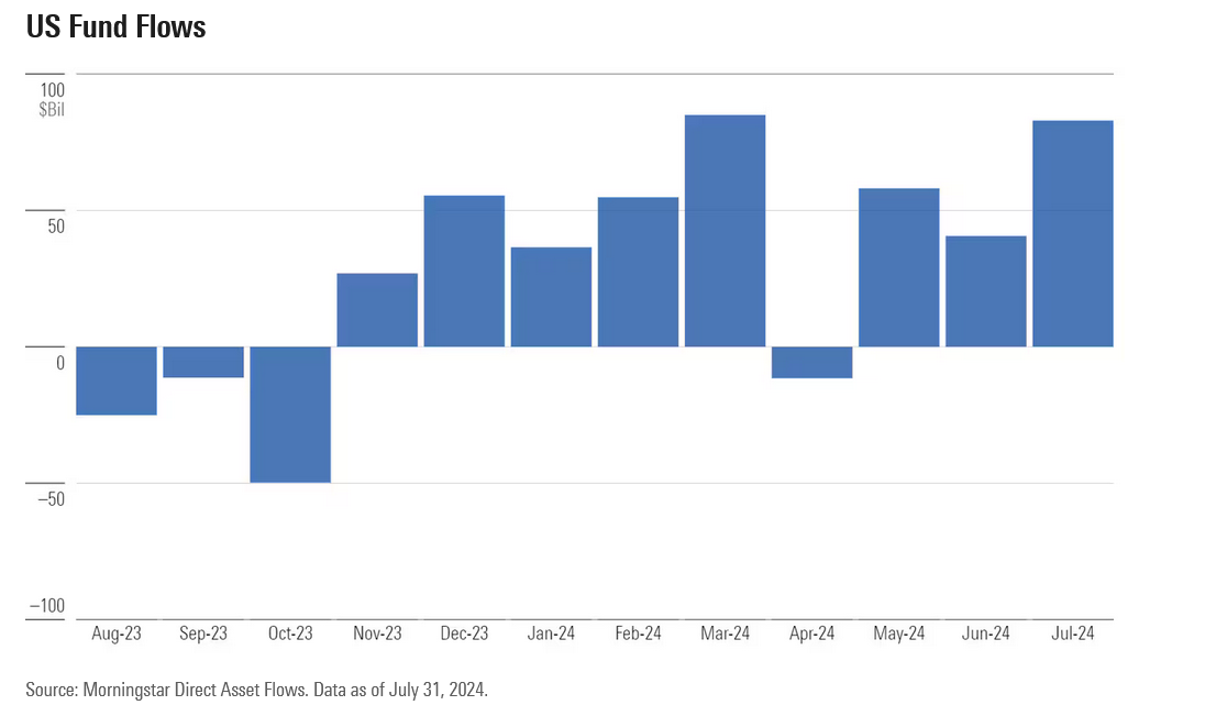 US funds experienced strong inflows in July, totaling $83 billion, according to data was sourced from Morningstar Direct. This marks the second-best month for fund flows so far this year. Equity funds generally saw moderate inflows, while fixed-income funds attracted larger sums.