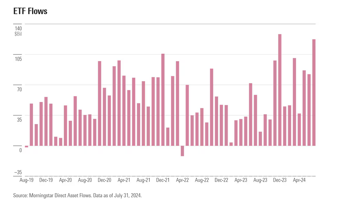 Exchange-traded funds (ETFs) continued their impressive performance, attracting $122 billion in July. This was the second-highest monthly inflow on record, falling just short of the $128 billion record set in December 2023. In contrast, mutual funds experienced outflows of $39 billion.