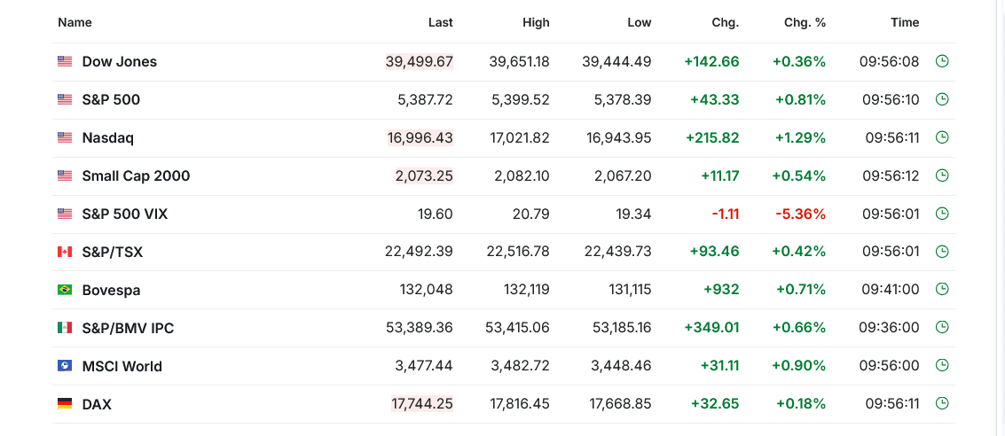 US stocks opened higher on Tuesday morning (ET). At 09:56 ET (13:56 GMT), the Dow Jones rose 142.66 points, or 0.36 per cent, at the open to 39,499.67.